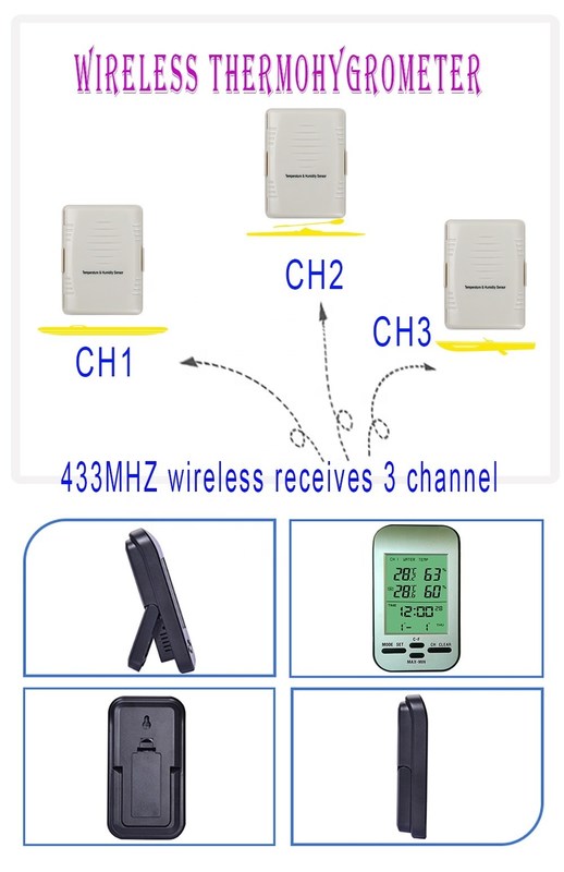 เครื่องรับสัญญาณภายในห้อง สามารถดูอุณหภูมิและความชื้นได้จากมุมสามแบบ 433MHZ รับข้อมูลแบบไร้สาย 3 ช่อง ไม่มีอุปสรรคและไม่มีการขัดแย้งในระยะ 100 เมตร