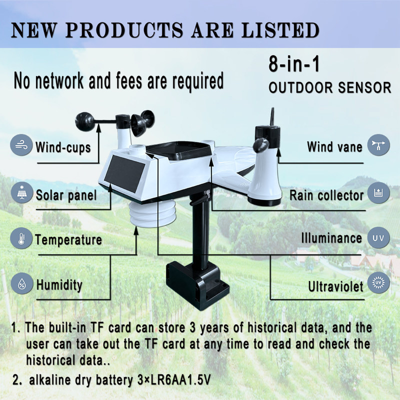 2. ฟังก์ชั่นการตรวจจับของเครื่องนี้คือ: อุณหภูมิ, ความชื้น, ความเร็วลม, ทิศทางลม, ปริมาณน้ำฝน, แสงไฟ, รังสีอัลตราไวโอเลต